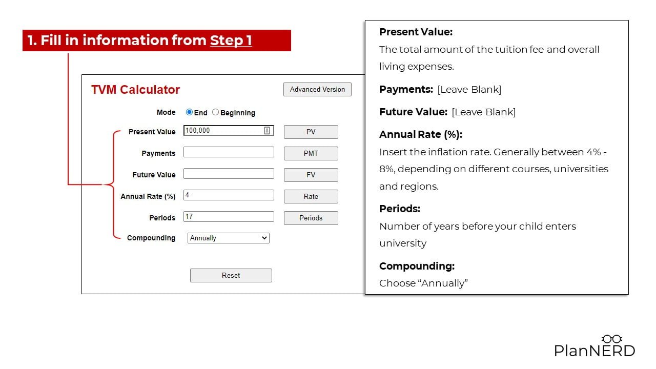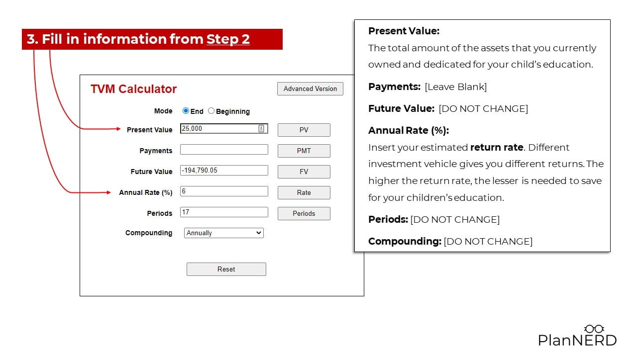 In this step, we will be using a free financial calculator available online to easily calculate how much do you need to save/invest for your children’s education. You can access the calculator HERE.