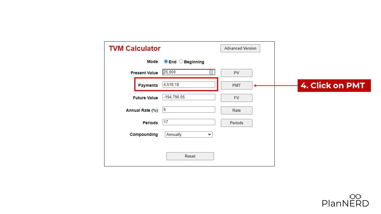 The last step is to click on “PMT” to calculate the amount needed to save/invest every year to cover the shortfall in your children’s education fund.